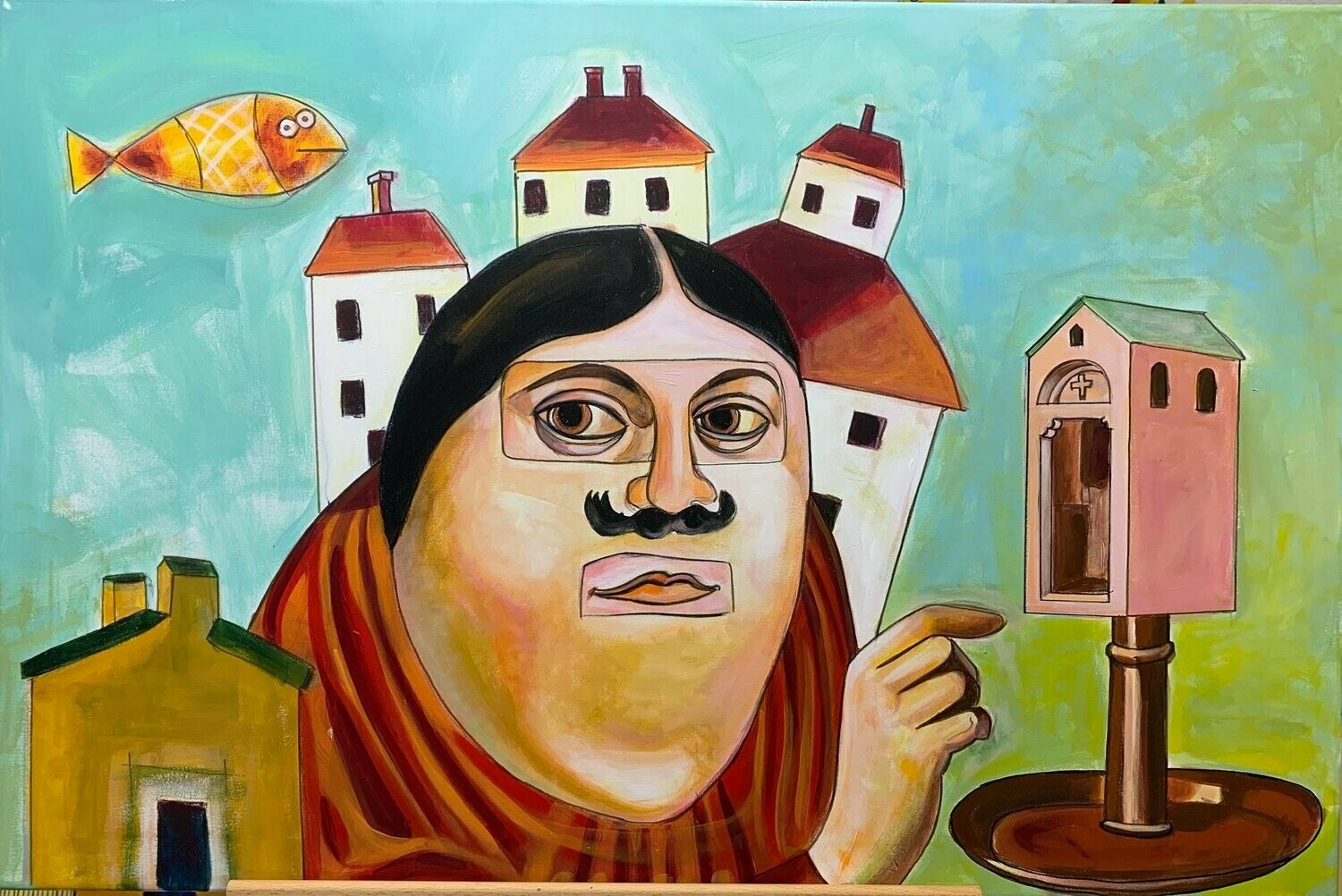 L'opera fa parte della serie nata dal lavoro di collage digitale realizzato con un software particolarmente divertente e creativo, trasformata poi in pittura.